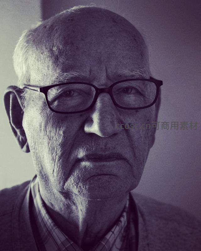 一张采用黑白滤镜拍摄的老人特写,他戴着眼镜,面容严肃,眼神深邃,背景简洁,凸显了岁月沉淀下的沉稳气质。