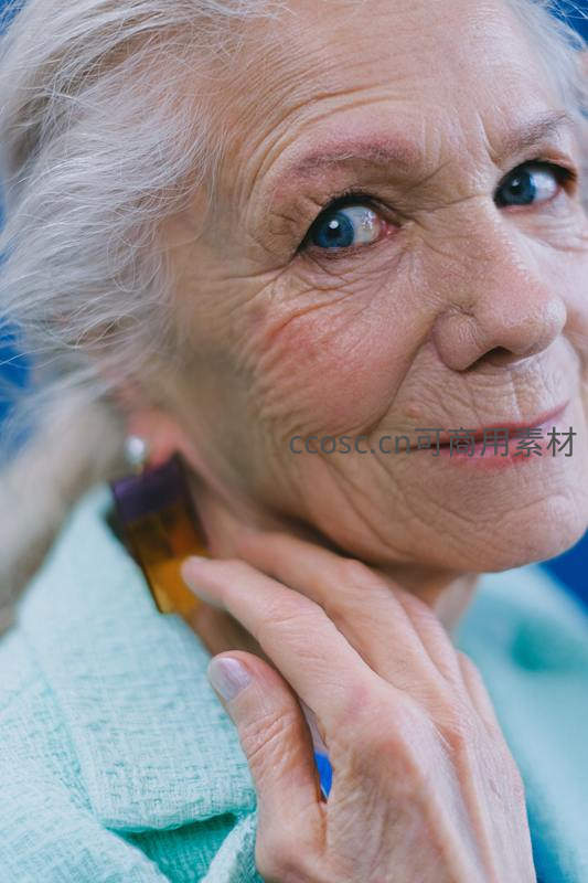 一位拥有明亮蓝眼睛的老年女性微微仰头,嘴角含笑,手轻轻托住下巴,眼神中充满智慧与慈爱,展现了岁月沉淀后的温婉与从容。