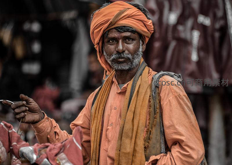 一位戴着橙色头巾、留着灰白胡须的老人在街头凝视镜头,他身穿传统服饰,背景是模糊的市集摊位,展现出浓郁的生活气息与地域文化。