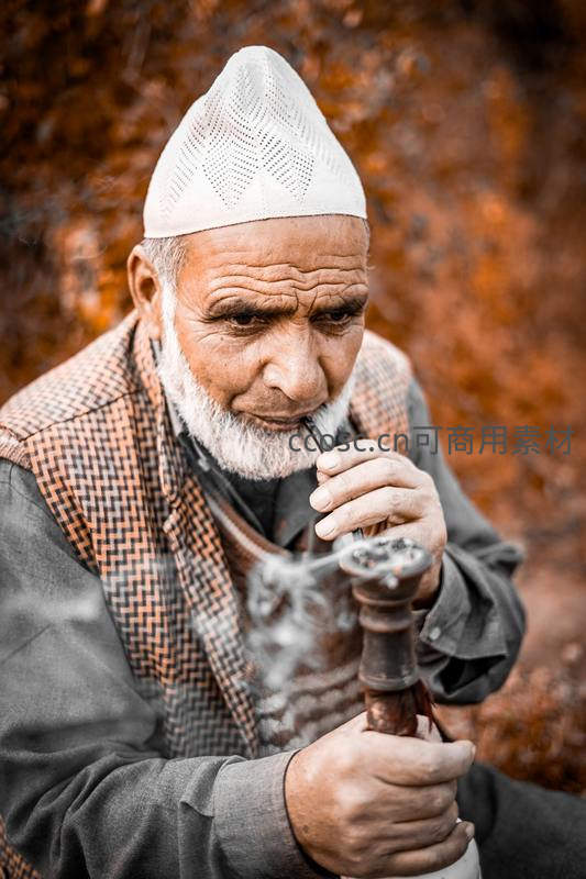 一位戴着白色传统帽子的老者正专注地抽着水烟,烟雾缭绕,他神情宁静,背景是暖色调的自然环境,展现了一种悠然自得的传统生活方式。