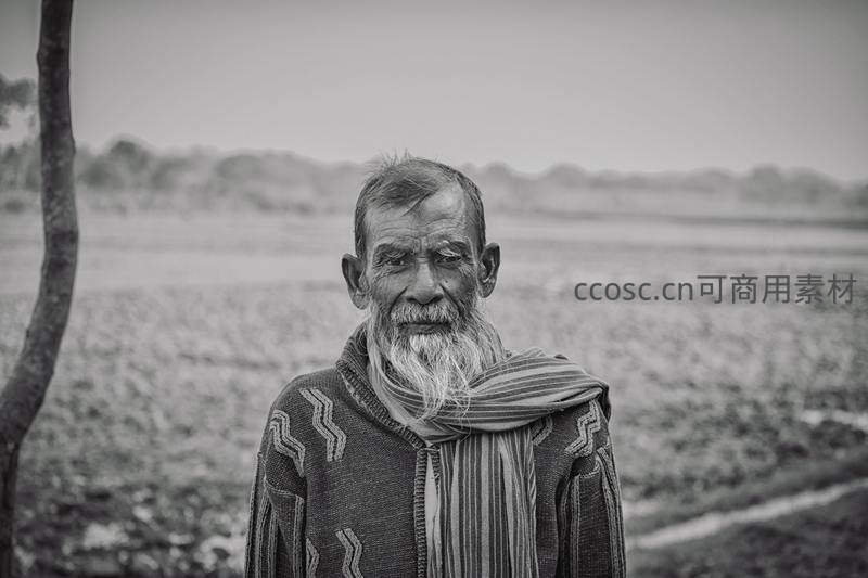 黑白照片中,一位长须老人站在开阔的田野前,面容沧桑而平静,身披条纹围巾,背景是广袤的农田,传递出一种宁静而厚重的乡土气息。