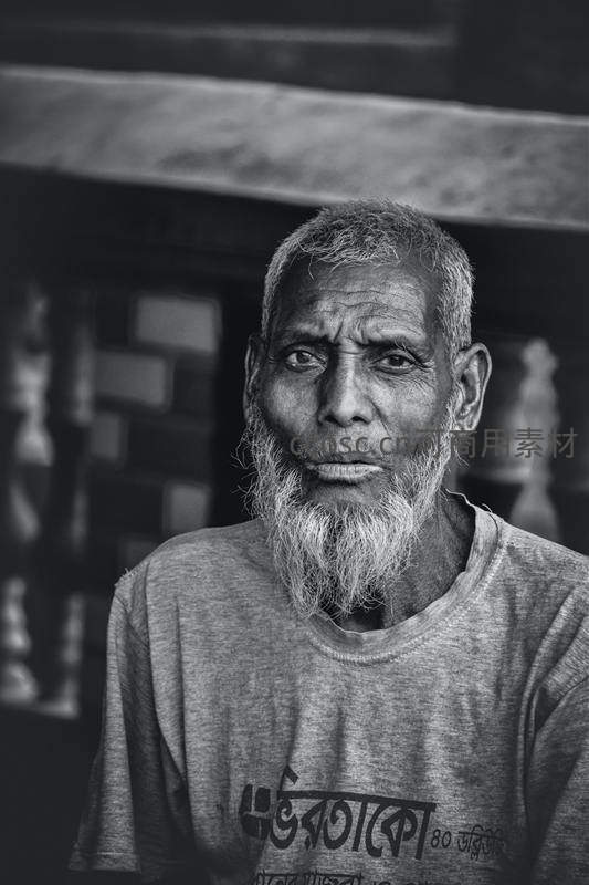 黑白影像捕捉到一位留着长胡须的老人,他目光深邃凝重,直视镜头,背景为模糊的室内结构,画面充满故事感,体现岁月沉淀下的坚韧与思考。