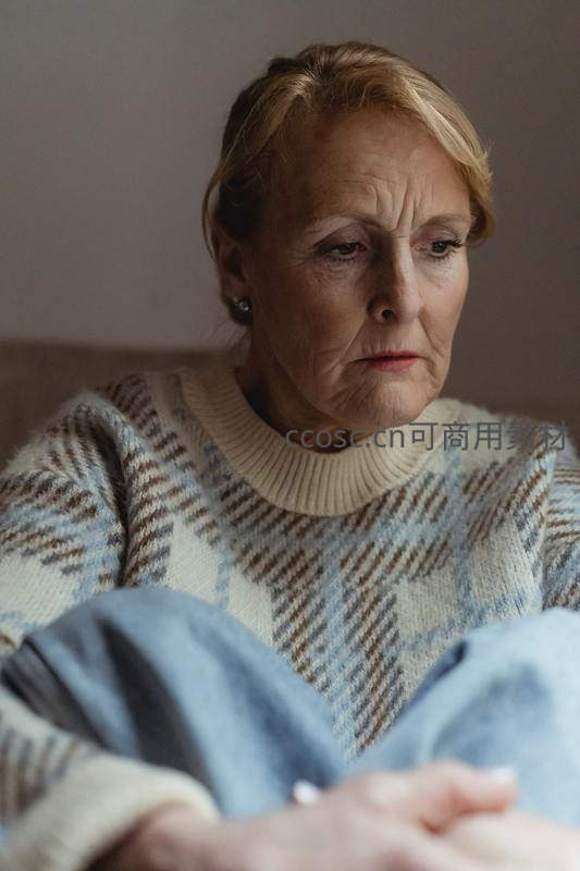 一位白发苍苍的老年女性坐在室内沙发上,身穿蓝白棕相间的格纹毛衣,低头凝视,神情略显忧郁,流露出岁月沉淀的宁静与思考。