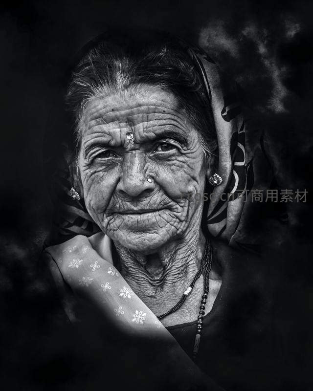 一位佩戴传统饰品的老年女性在纯黑背景下凝视镜头,面部纹理清晰可见,展现出历经沧桑后的从容与优雅。