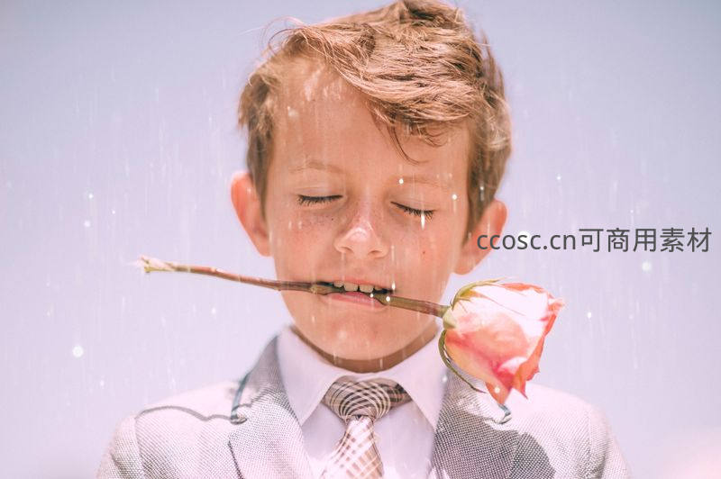 雨中少年衔玫瑰,闭目享受宁静时刻