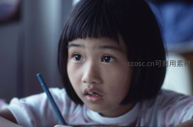 留着齐刘海短发的女孩正握着铅笔,眼神专注地望向一侧,似乎在思考难题,展现了学生时代认真学习的瞬间。