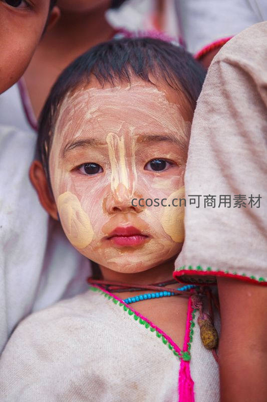 一位少数民族儿童脸上涂抹着传统天然面漆,眼神平静,身着带有彩色刺绣的传统服饰,展现了独特的民族文化与习俗。