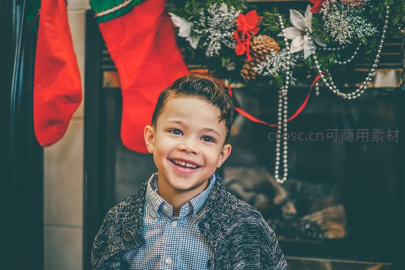 一个穿着格子衬衫和毛衣的小男孩在装饰着圣诞袜和花环的壁炉前开心地微笑,充满节日氛围。