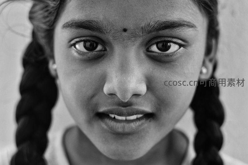 一张高对比度的黑白特写照片,聚焦于一位印度女孩清澈的眼神和整齐的双麻花辫,传递出宁静而深邃的情感力量。