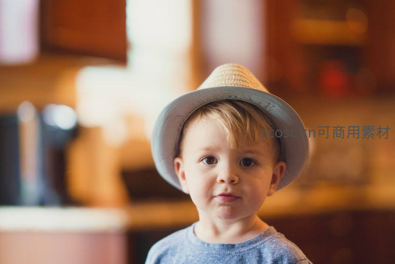 一个戴着浅色草帽的金发小男孩正对着镜头,眼神清澈,背景是温暖模糊的家居环境,充满童真与生活气息。