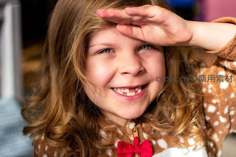 金发小女孩微笑着举起手遮挡阳光,露出可爱的缺牙笑容,身穿斑点图案毛衣,胸前系着红色蝴蝶结。