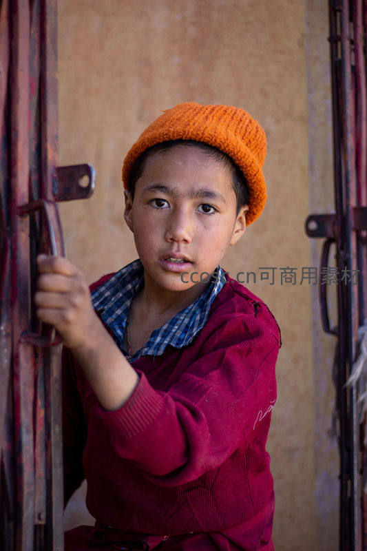 一名戴着橙色针织帽的少年,身穿红色毛衣和格子衬衫,正从一扇旧铁门后探出头来,眼神充满好奇。