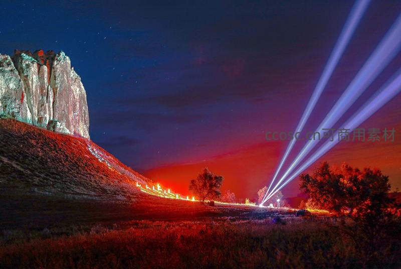 几道强烈的白色激光束刺破夜空,照亮被红色灯光渲染的峡谷岩壁,营造出充满未来感与戏剧张力的视觉奇观。