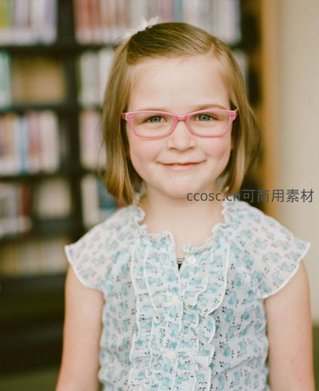 戴着粉色眼镜的小女孩站在书架前,面带甜美微笑,展现出热爱阅读、聪慧可爱的气质。