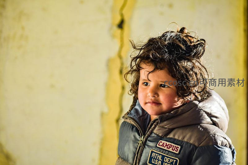 一个卷发的小孩穿着厚实的羽绒服,眼神专注地望向镜头,身后是泛黄且有裂痕的墙壁,光线柔和,充满生活气息。