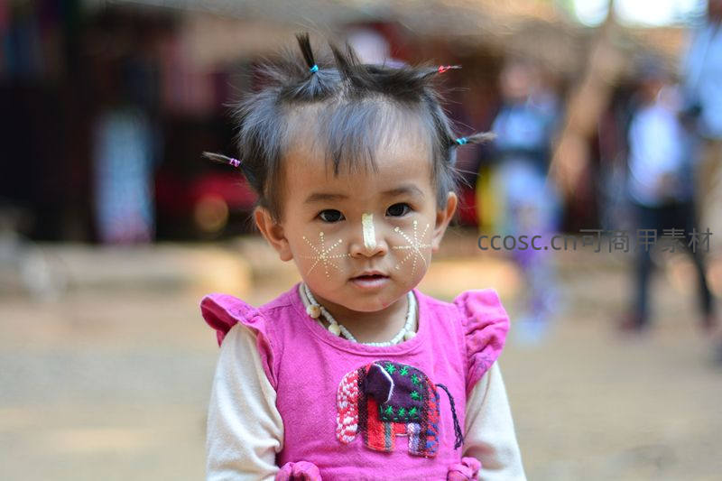 一位小女孩脸上绘有白色星形图案,身穿粉色民族风上衣,佩戴小珠链,背景模糊似集市,展现浓郁地方文化特色。
