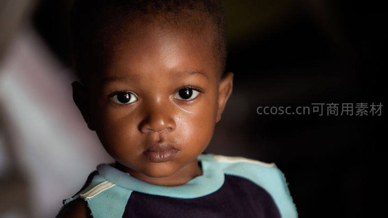 一名深肤色幼儿穿着拼色背心,在昏暗背景下凝视前方,眼神深邃而宁静,展现出孩子特有的纯净与沉思气质。