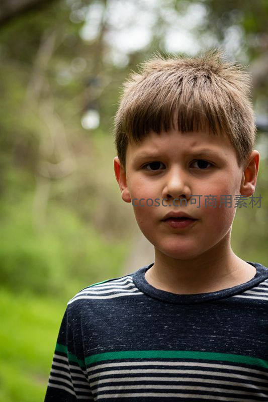 一个金发男孩身处郁郁葱葱的树林中,他穿着深色条纹T恤,表情严肃认真地直视镜头,背景是模糊的绿色植被,营造出一种沉静的氛围。