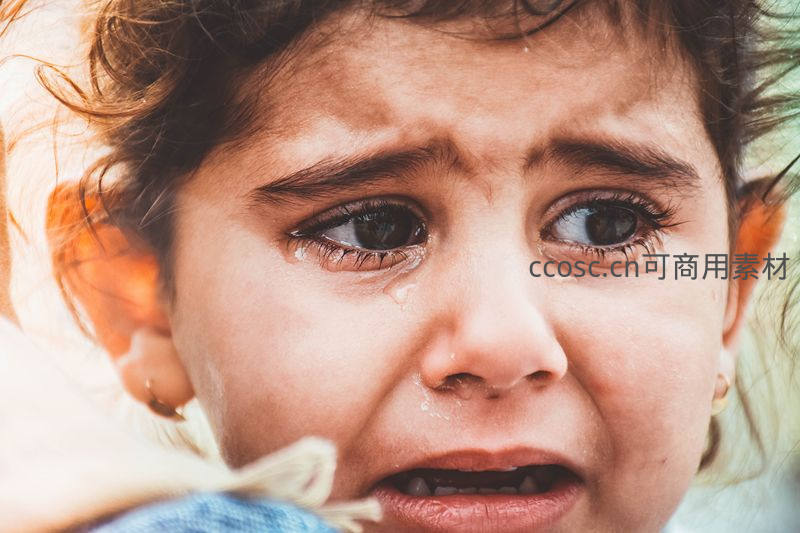 一个年幼的孩子正伤心落泪,泪水从大大的眼睛中滑落,眉头紧锁,嘴唇微张,流露出无助与委屈的真实情感。
