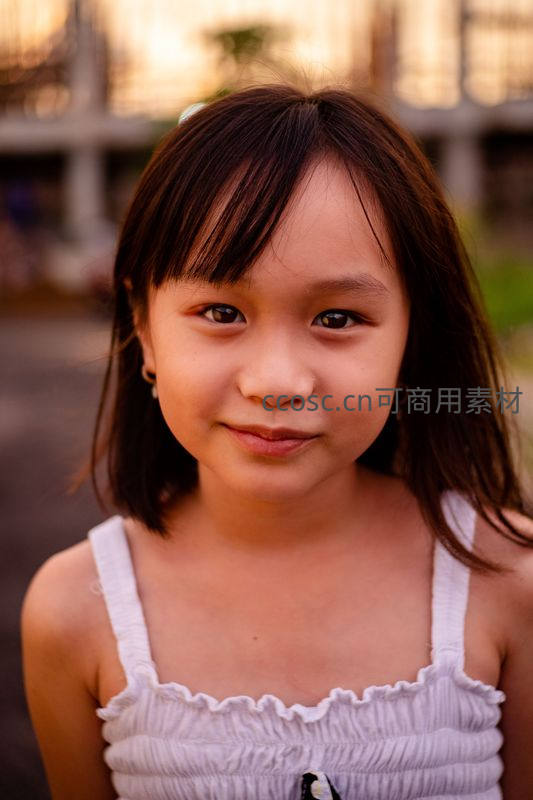 在柔和的夕阳余晖中,一位留着齐刘海的女孩对着镜头温柔微笑,背景虚化,突出她恬静美好的神态。
