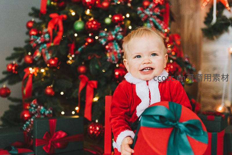 身穿红色圣诞服的婴儿坐在装饰华丽的圣诞树前,手捧大礼盒,咧嘴大笑,充满节日喜悦与纯真快乐的氛围。