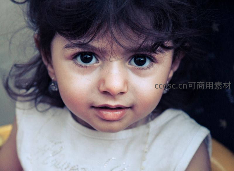 镜头聚焦于小女孩清澈明亮的大眼睛,她带着一丝好奇与懵懂直视前方,蓬松的卷发和精致的耳饰更添几分娇俏与灵动。
