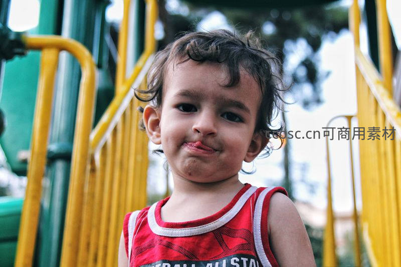 一个卷发小男孩在户外游乐场的黄色滑梯前,穿着红色背心,俏皮地吐着舌头,眼神灵动,充满童真与活力。
