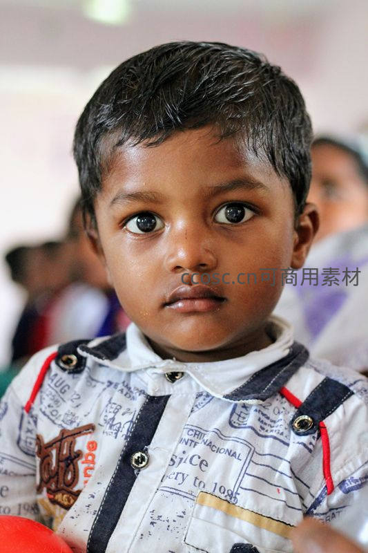 一个小男孩身穿印有字母图案的衬衫,睁着明亮的大眼睛专注凝视镜头,背景模糊中透出人群,凸显其纯真与好奇神情。