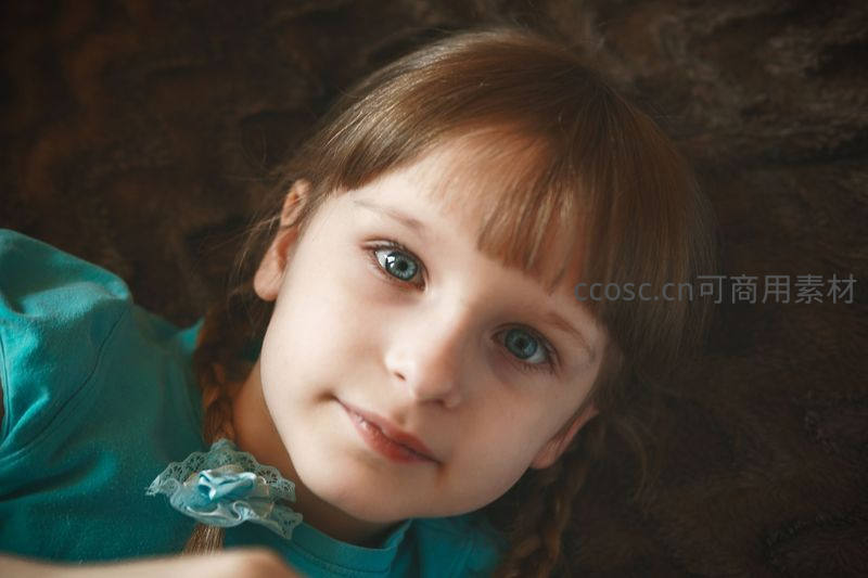 蓝眼女孩仰卧微笑,发辫轻柔可爱