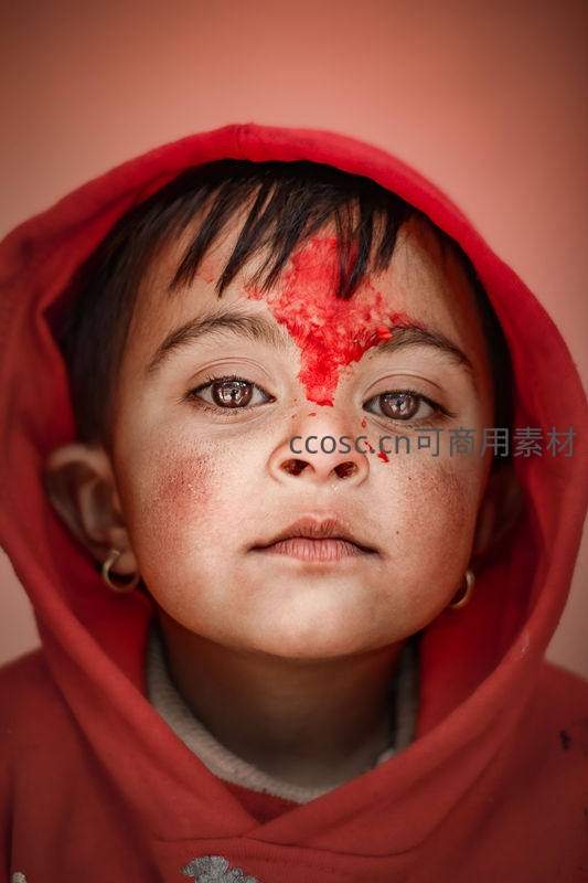 一个戴着红色连帽衫的孩子,额头绘有鲜艳的红色传统图案,神情庄重,似乎参与某种文化或宗教庆典活动。