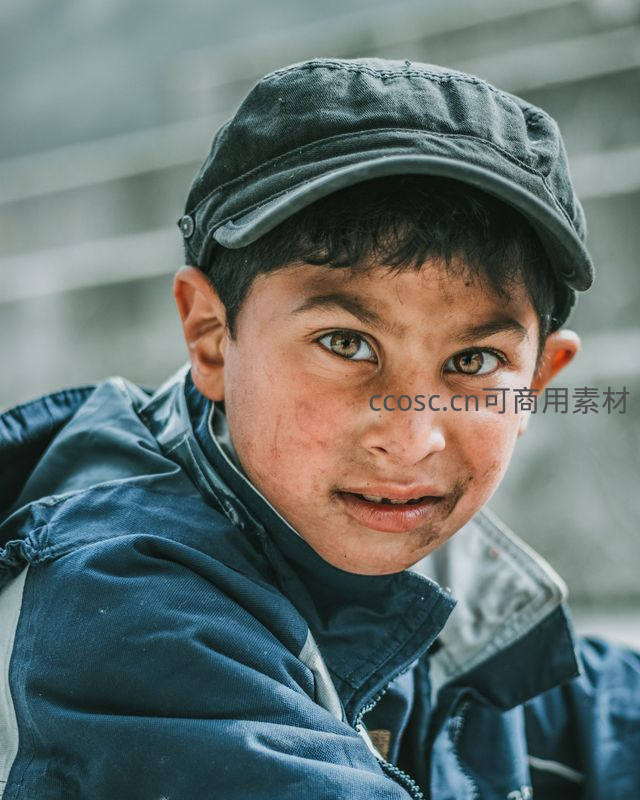 一个戴着深色帽子的小男孩,脸上带着些许污渍,眼神清澈而真诚地望向镜头,展现出孩童特有的纯真与活力。
