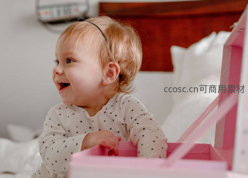一个金发女婴坐在床上,兴奋地张开嘴巴,双手正打开一个粉色的礼品盒,享受着拆礼物带来的纯粹快乐。