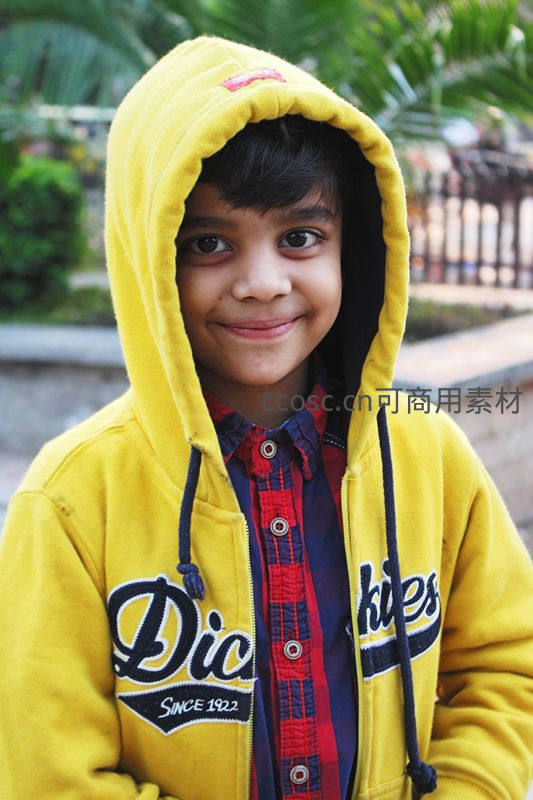 一个穿着鲜艳黄色连帽卫衣的男孩,在户外阳光下对着镜头露出温暖的微笑,背景是模糊的绿植,显得活泼又惬意。