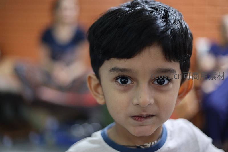 一张男孩面部的近距离特写,他有着乌黑的头发和明亮的眼睛,正直接凝视镜头,背景中的人群被虚化,突出其纯真表情。