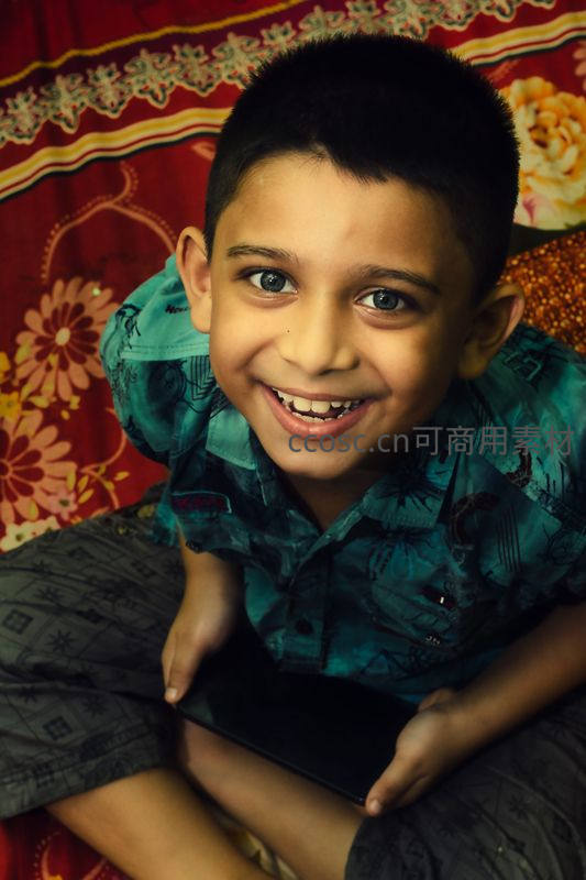 一个男孩坐在带有花纹的红色地毯上,双手抱着一台平板电脑,仰头对着镜头开心大笑,展现出无拘无束的快乐时光。