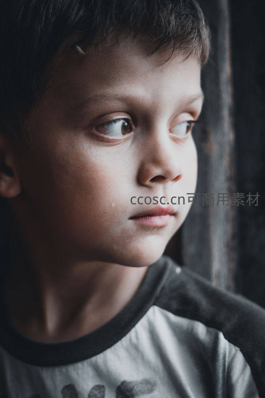男孩靠在窗边,侧脸沐浴在柔和光线下,眼神望向窗外,表情略带忧郁与沉思,仿佛在思考心事,营造出安静而富有故事感的氛围。