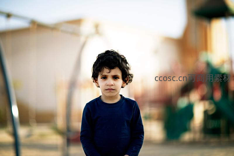 一个小男孩站在模糊的游乐设施前,深色卷发,表情严肃而专注,与欢乐的环境形成对比,引人思考其内心世界。
