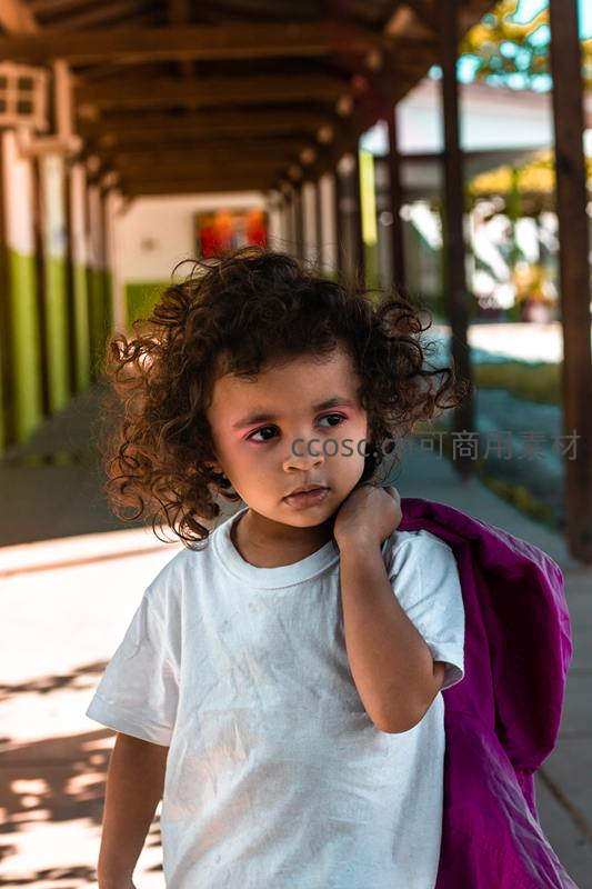 一个有着蓬松卷发的小女孩站在有顶棚的走廊下,身穿白色T恤,肩上搭着紫色外套,眼神专注而略带忧郁,阳光透过缝隙洒在她身上。