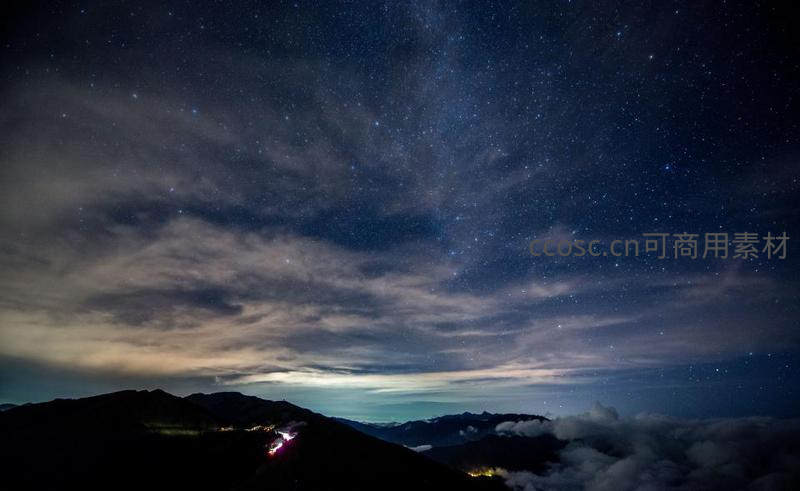 站在云海之上,星河穿越薄云,山峦起伏于脚下,远处微光点缀,如置身仙境般奇幻。
