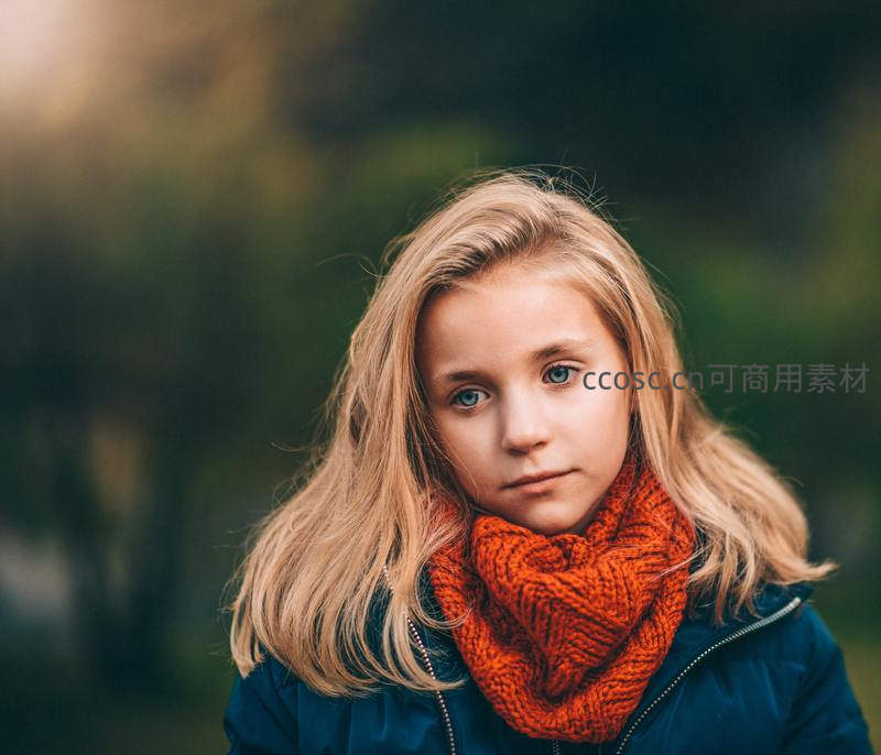 一位金发碧眼的少女在户外自然光下凝视镜头,身穿深色外套围着橙色针织围巾,背景虚化呈现温暖秋意。