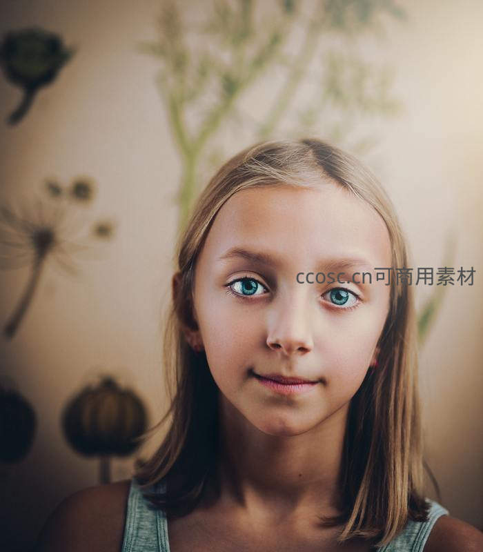 女孩站在印有植物图案的背景墙前,清澈的蓝眼睛直视镜头,嘴角微扬,散发出纯净自然的青春气息。