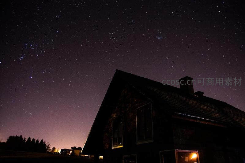 木屋在璀璨星空下静立,窗内透出暖黄灯光,与冷色调夜空形成对比,充满诗意与安宁。
