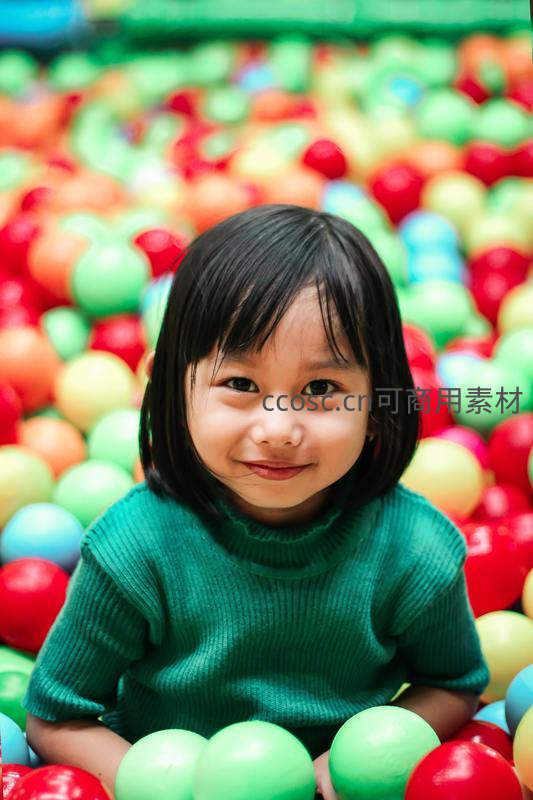 一个穿着绿色高领毛衣的小女孩坐在五彩缤纷的海洋球池中,她对着镜头露出天真烂漫的微笑,背景是模糊的彩色球海。