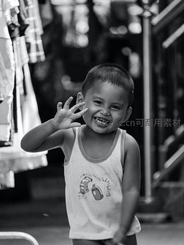 一个穿着背心的小男孩站在街头,咧嘴大笑并热情挥手,黑白影像更突显其纯真快乐的表情,背景是模糊的市集摊位。