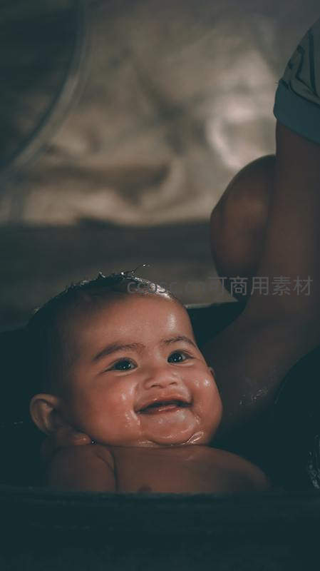 一个可爱的婴儿在浴盆中被温柔地抱着,脸上洋溢着纯真的笑容,水珠在灯光下闪闪发亮,营造出温暖而幸福的家庭氛围。