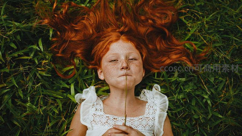 从上往下拍摄,红发女孩身穿白色蕾丝裙安静躺在翠绿草地上,长发如火焰般散开,手持草茎,画面宁静而富有诗意。