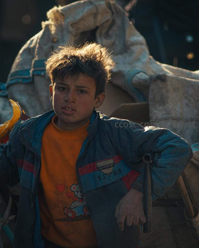 街头少年眼神坚毅,背景堆满杂物