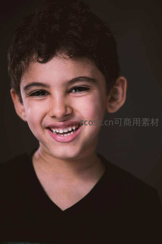 一个有着蓬松卷发的男孩对着镜头灿烂微笑,露出整齐洁白的牙齿,柔和的光线勾勒出他脸颊的轮廓,充满阳光与幸福感。