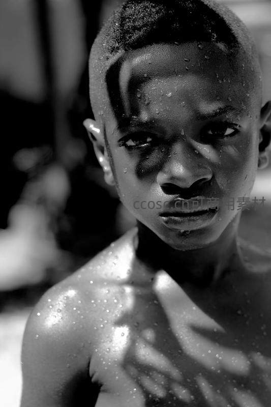 一个赤裸上身的男孩脸上和肩头布满晶莹水珠,在黑白光影下显得格外生动,眼神专注而深邃,仿佛刚从水中嬉戏归来。