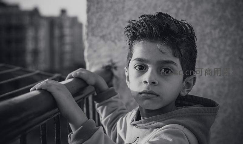 一名小男孩站在阳台上,双手扶着栏杆,眼神略带忧郁地望向远方,身后是模糊的城市建筑群,营造出静谧沉思的氛围。